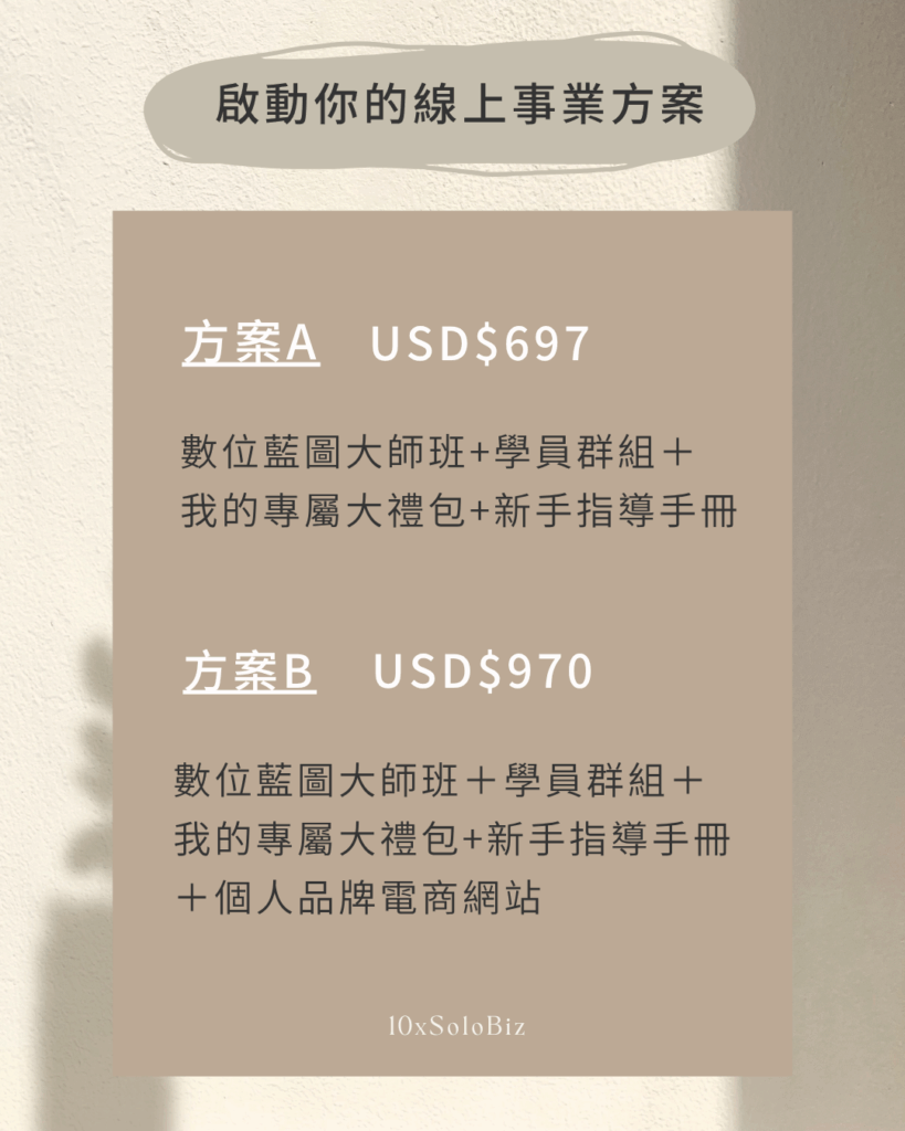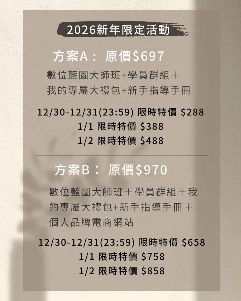 數位藍圖大師班+學員群組+我的專屬大禮包+新手指導手冊+個人品牌電商網站