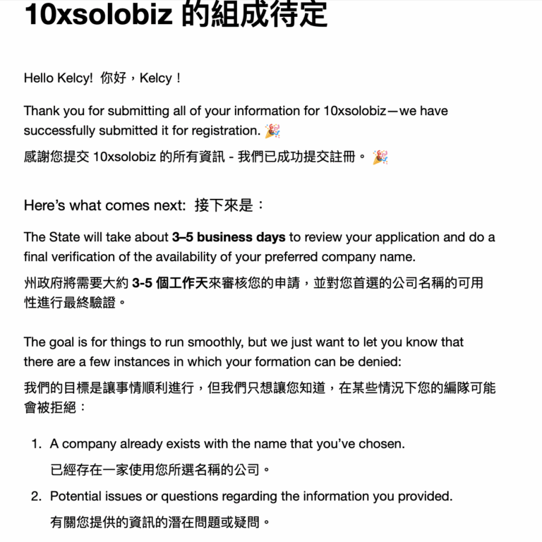 (我有開過兩次台灣公司經驗,我覺得美國公司開辦過程比開台灣輕鬆太多了)