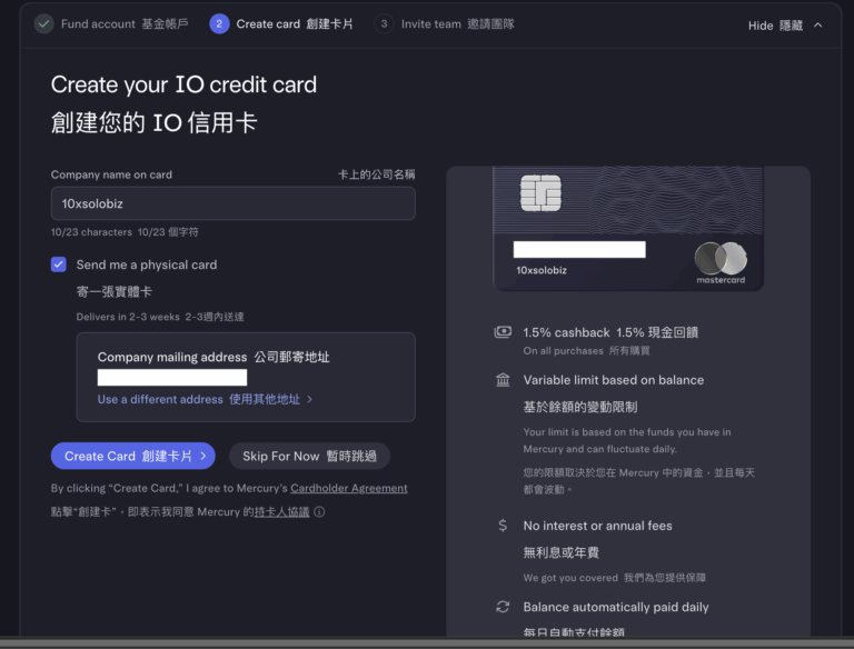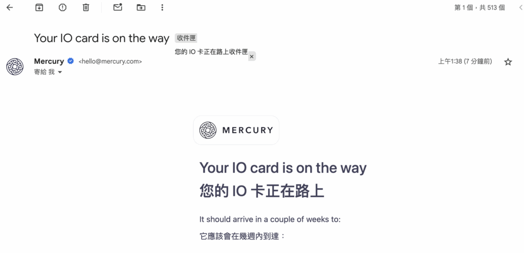 以 Mercury 為例,開戶後銀行會寄出實體 Visa Debit 卡,